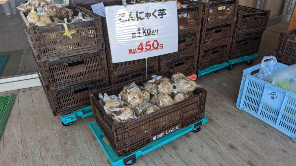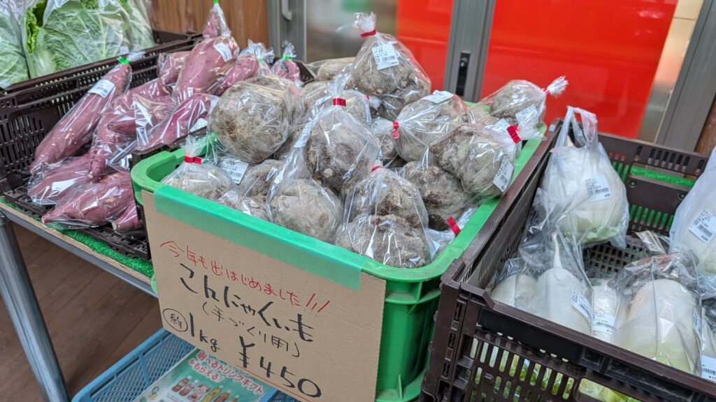 こんにゃく芋(生芋)の店頭販売が始まりました。今年度は芋の掘り取りが遅れており、例年よりも遅い入荷となりました。価格は約1㎏(2~3玉)で税込450円です。
